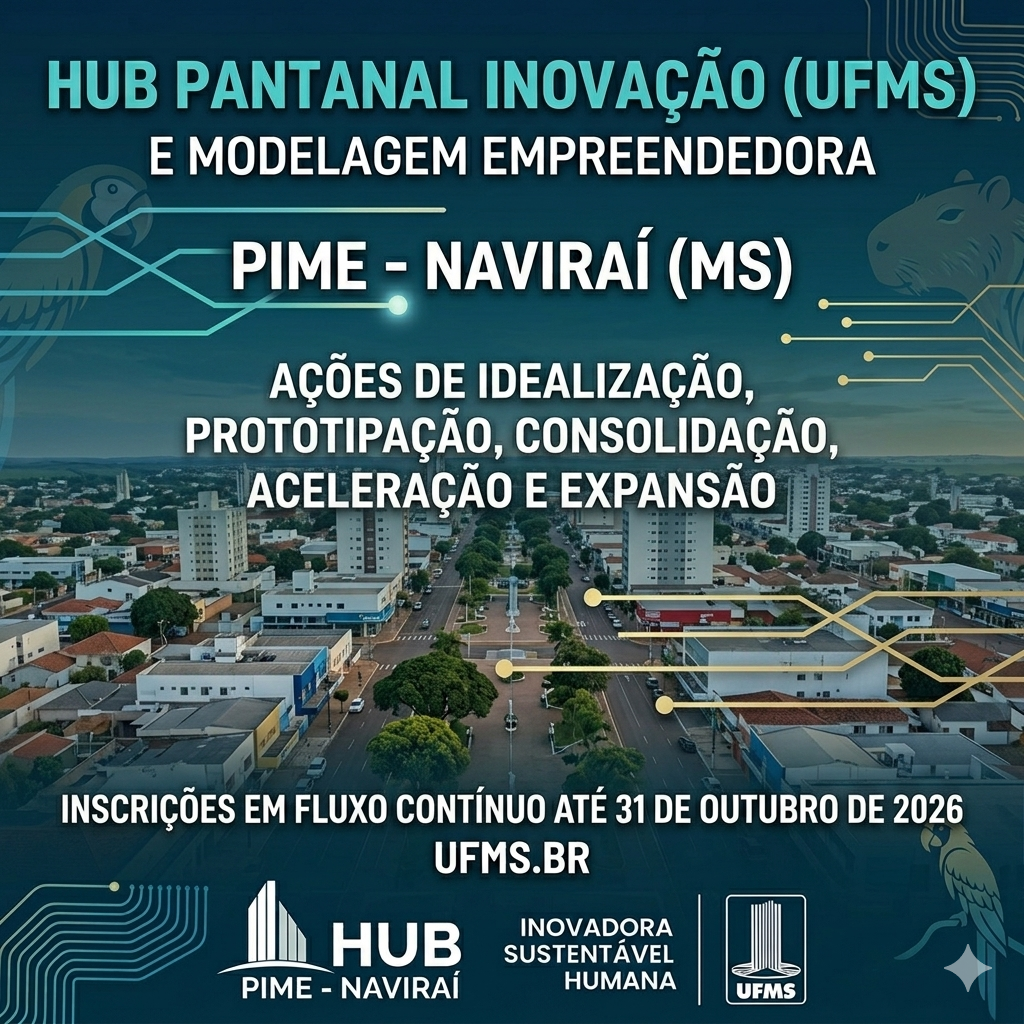 A Universidade Federal de Mato Grosso do Sul, por meio da Agência de Inovação da UFMS (AGINOVA), lançou o Edital nº 6/2026 para seleção de empreendimentos que desejam participar do HUB Pantanal Inovação e Modelagem Empreendedora (HUB PIME).